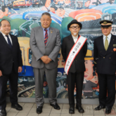 ご当地デザインを施した壁画の前で記念撮影