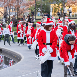 同イベントは、グラングリーン大阪の先行まちびらきを機に昨年初開催され、今回で2回目。両施設の就業者や関係者、一般公募の参加者ら約650人がサンタクロース姿でうめきたエリアを練り歩いた。