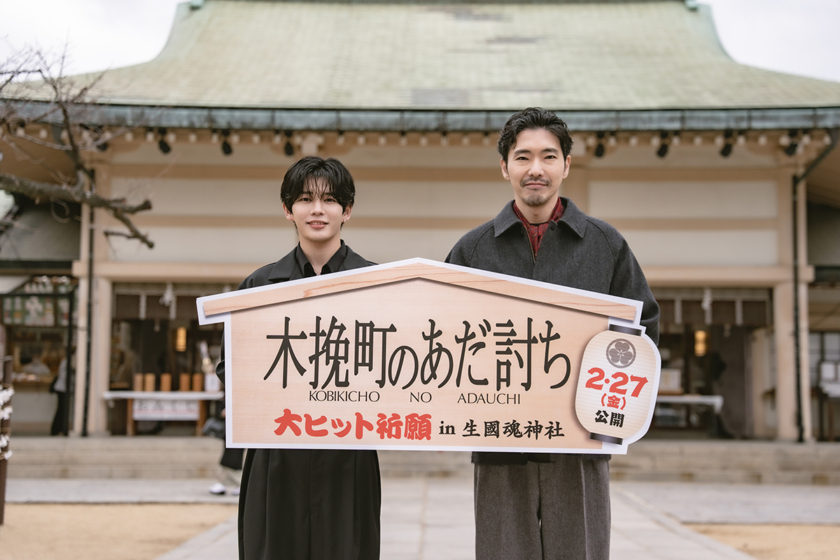生國魂神社(大阪市天王寺区)で2月9日、映画「木挽町のあだ討ち」(2月27日全国公開)のヒットを祈願するイベントが行われ、柄本佑さんと長尾謙杜さんが参加した。