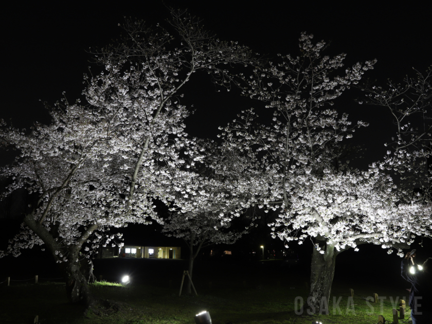 桜が見頃を迎えている万博記念公園(大阪府吹田市)で4月1日から、「東大路の桜並木ライトアップ」が行われている。