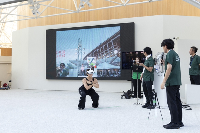 来場者はふくらはぎにセンサーを装着し、歩くだけで自分の歩行能力が数値化され、AIアバターとともに運動できる“未来のFitnessジム”を体感しました。シンプルな操作で結果が得られる手軽さと、最先端技術によるフィードバックは多世代から高く評価されました。本学大学院生が進行を担当し、歩行年齢の測定からAIアバターとの運動まで盛り上げてくれました。