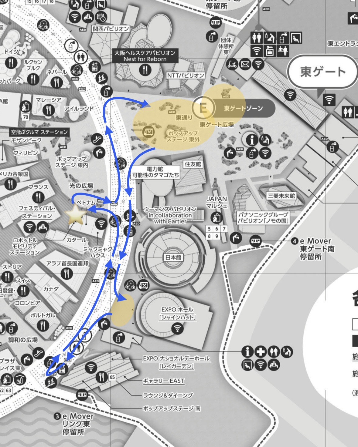 STATION(ロボット&モビリティステーション)」を出発し、東ゲート広場、シャインハット前、大屋根リング下を通り、ROBOT&MOBILITY