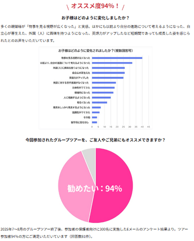 2025年7月~8月の夏休みグループツアー終了後に、参加者の保護者向けにアンケート調査を実施しました。「今回参加されたグループツアーを友人や兄弟にもお勧めできますか?」の設問に対して、回答者の94%が「勧めたい」と回答。ツアー参加後のお子様の変化について聞いたところ、「物事を見る視野が広くなった」「以前より自分の進路について考えるようになった」「外国(人)に興味を持つようになった」「自立心が芽生えた」が上位となり、保護者が期待する成果が見られる結果になりました。