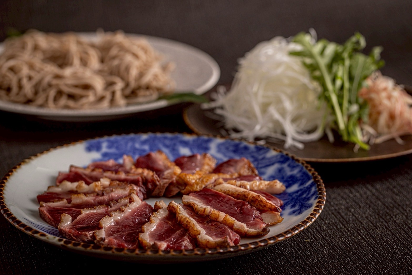 メニューは「串焼と炊込御飯コース」(1万2,000円)「串焼と鴨しゃぶコース」(1万5,000円)のコース2種のみ。カウンター越しに焼師や料理人の手さばきを見ながら、【つくりたて】、できたての料理を楽しんでほしいという思いから、あえて席数を絞り、コースでの提供に至りました。京都「北山杉」を使ったカウンターや照明の明るさを落とした店内は、デートや会食などにぴったりの高級感溢れる空間に仕上げています。