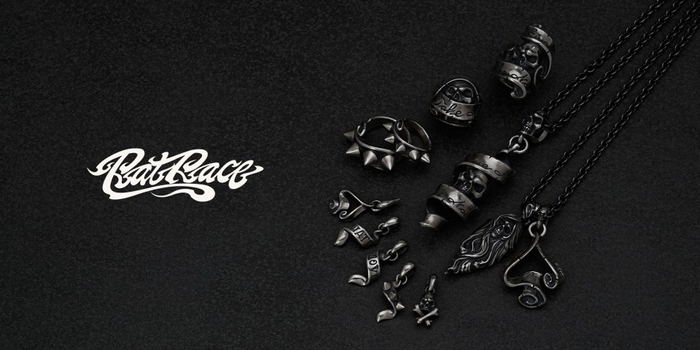 1997年に創設者かつデザイナーであるRat Gjo(ラットジージョ)が自身の納得のいく究極のスカルを追求する為に始動。自然というモチーフの中の究極の造形物の一つとしてスカルを捉え、その曲線やバランスに独自のデザインを落とし込む。キングオブスカルと評されるシルバーアクセサリーブランド。創設以来、精緻な造形と存在感あふれるデザインで国内外のファンを魅了してきたRAT RACE。「Today is a very good day, to Die」(死に日和)を座右の銘に、妥協なき物作りを追及している。全ての商品一つ一つバフ(研磨器具)を使わずにリューターのみを用いて磨き上げるという徹底した手法を採用。独特の仕上げに拘っており、すべての作品一点一点に魂を込めた手彫りのサインを入れて仕上げを行い、妥協なき姿勢をみせている。骸骨や有機的なモチーフ独自の解釈で表現し、シルバーという素材の可能性極限まで引き出す作品は、単なるアクセサリーを超えた「身にまをとうアート」として高く評価されている。