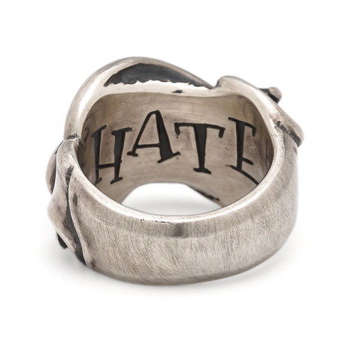“Give No, Take No”とオールドイングリッシュ書体で刻んだリボンの隙間からスカルが覗くギャングスピリッツ溢れる初期作ながら変わらぬ人気のリング。