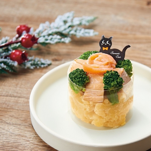 愛猫がよろこぶケーキ仕立ての華やかデリ。スイートポテトを土台に薔薇のように巻いたスモークサーモンと、嗜好性抜群のスモークチキン・ブロッコリーでデコレーション。