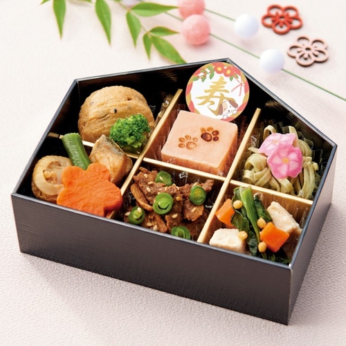 お正月の定番であるお雑煮をイメージした鶏肉のお肉料理などを絵馬に見立てたお重に詰めました。