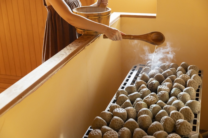 サウナ室内には新たにご当地ロウリュとして加賀棒茶を導入いたします。石川県を代表する加賀棒茶を熱したサウナストーンにかけると、心地よい音とともに香ばしい蒸気が立ち上がり「和の香り」に癒される空間へと生まれ変わります。奥深い香りに包まれながら、心身ともに解き放たれる特別なひと時をお楽しみください。