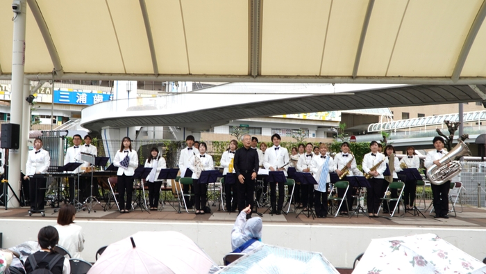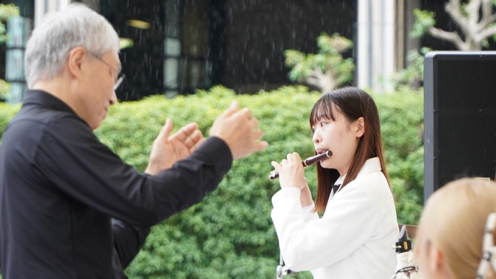 当日は雨模様で、後半には激しく降り出しましたが、学生たちの雨にも負けない熱い演奏に、瀬野守口市長や市民が傘をさしながらも、最後まで聴き入っていました。