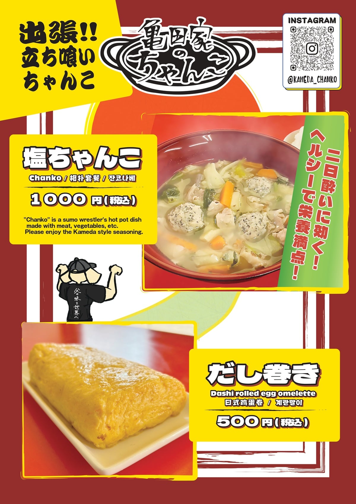 販売商品:塩ちゃんこ、だし巻き、フラワーツイスター、生クリームのラッシーなど