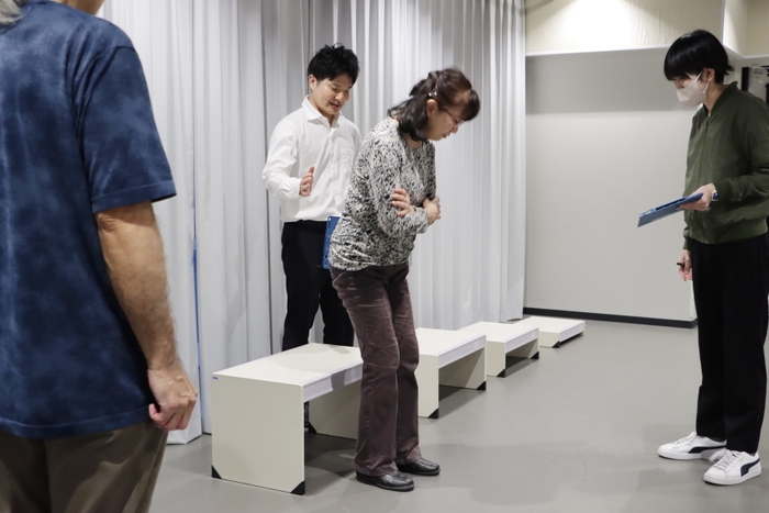 3時間の体験会には21名が参加し、立ち上がりテスト・ステップテスト・握力テストによる「体力年齢測定(ロコモチェック)」も実施。参加者は「こんなに動かしづらいとは思わなかった」「段差がこんなに怖いのは初めて」と感想を述べ、理学療法士との対話を通じて、身体の構造や補助の方法を学びました。