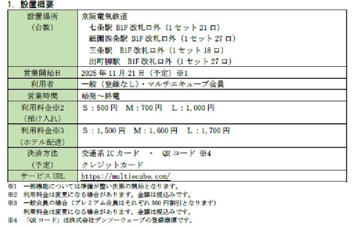 京阪ホールディングス株式会社(社長:平川 良浩、以下「京阪ホールディングス」)、京阪電気鉄道株式会社(社長:井上 欣也、以下「京阪電気鉄道」)と株式会社JR東日本スマートロジスティクス(代表取締役:市原 康史、以下「JR東日本スマロジ」)は、予約・キャッシュレス・多言語対応可能な多機能ロッカー『マルチエキューブ』を、京阪電気鉄道の京都市内の4駅(七条、祇園四条、三条、出町柳)に2025年11月21日(金)より設置いたします。