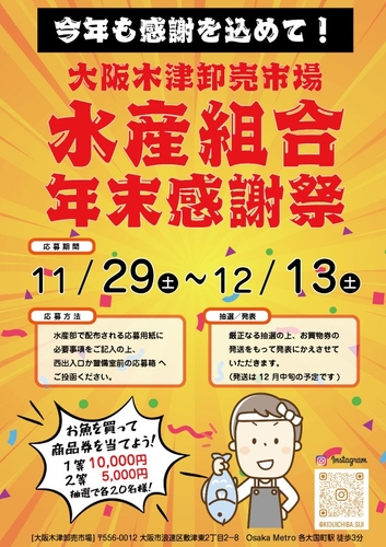 大阪木津卸売市場は、一年間のご愛顧に感謝を込め、生活応援企画として歳末大感謝抽選会を実施いたします。本抽選会では、水産部でご利用いただけるお買物券1万円券20名様、5千円券20名様をご用意いたしました。