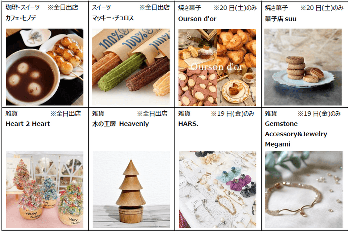 クリスマスの雰囲気を楽しめるお料理や温かい飲み物、さらにギフトにお勧めのお菓子や雑貨などが登場。約25店舗のお店が日替わりで立ち並びます。