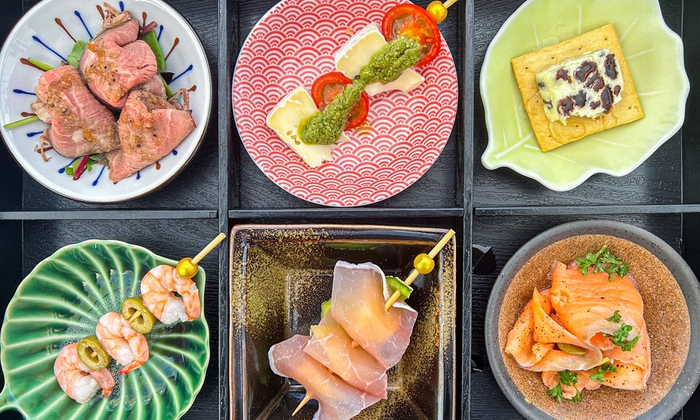 フィンガーフード6種類(ローストビーフ、スモークサーモン、トマトとカマンベールのピンチョス、カクテルシュリンプ、レーズンバター、生ハムメロンなど)