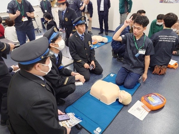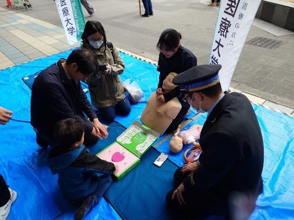 午後には場所をJR京橋駅北口前広場に移し、本学ライフサポート部の学生とJR京橋統括駅の職員や午前の部の参加者が連携して、一般の方を対象とした心肺蘇生法やAEDの使用方法などの一次救命処置(BLS)体験会「救急フェア IN 京橋駅前」を開催しました。京橋駅付近を通行されるご家族連れをはじめ、幅広い年齢層の方にご参加いただくことができました。体験者数は2時間で100名を超え、会場は終始活気に満ち賑わいをみせました。多くの方に一次救命処置の重要性を体感いただき、実践方法を学んでいただく機会となりました。