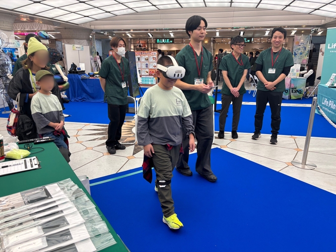 本学からは、インクルーシブ医科学研究所の工藤慎太郎所長(教授)が、株式会社フォーカスシステムズおよびTOPPAN株式会社と共同開発した「WalkCare」を出展しました。「WalkCare」は、大阪・関西万博 大阪ヘルスケアパビリオン リボーンステージでも出展した技術で、ふくらはぎにセンサーを装着して歩くだけで、自身の歩行能力が数値化され、AIアバターとともに運動できる“未来のFitnessジム”です。当日は来場者に体験していただく形式で展示を行い、待ち列ができるほどの盛況となりました。両日合わせて200名以上の来場者がブースを訪れ、お子さまからご高齢の方まで幅広い世代の180名の方に実際に体験していただきました。
