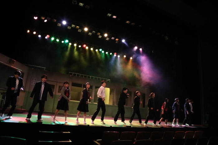 オープニングは華やかなファンクミュージックに乗せて13名の生徒キャストが踊る。まるでミュージカルのような演出に驚くが、これこそまさに舞台の楽しさ。目の前で踊るキャストがこれからどんな悩みや格好を見せてくれるのかワクワクする。