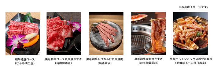 対象店舗は「焼肉レストランぴゅあ」「焼肉本舗ぴゅあ」「焼肉すき焼き純」「弐日市亭」で、いずれも全国の産地から仕入れた国産黒毛和牛・国産豚を中心に、お肉の美味しさを存分に楽しめるお店です。