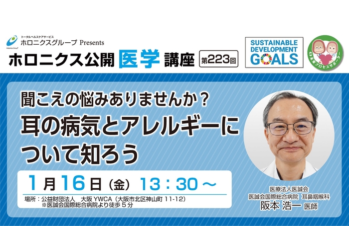 医療法人医誠会(本社:大阪府大阪市、代表者:谷 幸治)は、公益財団法人 大阪YWCAの依頼を受け、2026年1月16日(金)に大阪YWCAにて、出張講座「聞こえの悩みありませんか? 耳の病気とアレルギーについて知ろう」を実施します。本講座では、加齢に伴い増加する難聴や、聞き取りにくさを感じながらも受診に至りにくい現状を踏まえ、耳鼻咽喉科の医師が聞こえの仕組みや対策をわかりやすく解説し、正しい理解につなげる機会とします。