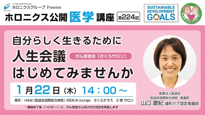 医療法人医誠会(本社:大阪府大阪市、代表者:谷 幸治)は、2026年1月22日(木)、医誠会国際総合病院にて、がん患者会「さくらサロン」として講座「自分らしく生きるために 人生会議はじめてみませんか」を開催します。本講座は、がん患者さんやその家族、地域の皆さんを対象に、人生の最終段階に備えた医療やケアの考え方を共有することを目的としています。講座終了後には交流会を設け、参加者同士が自由に思いを語り合える時間とします。