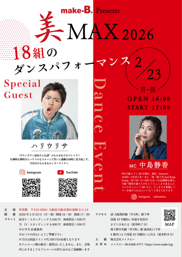 株式会社メイクビー(所在地:大阪市淀川区西中島5-8-26、代表:三宅有紀)は、ダンスとエンターテイメントの融合イベント「美MAX 2026」を2026年2月23日(月祝)に大阪市浪速区の世界館にて開催することを発表いたします。