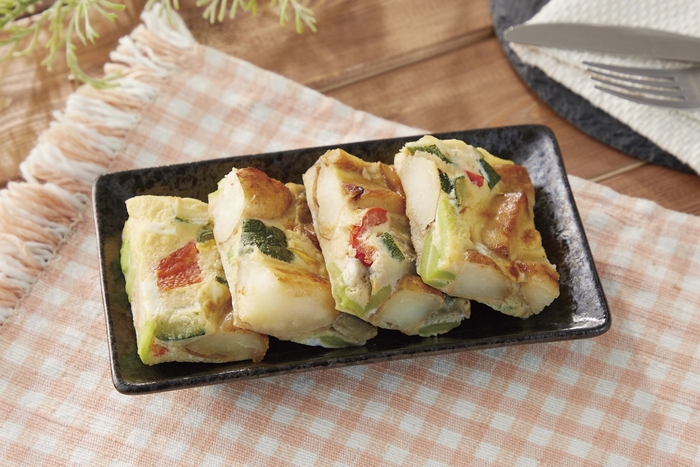 野菜の配合比率が50%以上になるよう、北海道産じゃがいも・ズッキーニ・赤パプリカ・黄パプリカ・なす・そら豆を入れて彩り豊かに仕上げました。味付けは塩こうじをベースに、野菜だしや粉チーズでコクをプラスしています。できるだけ食品添加物を少なくした、素材本来の味わいをお楽しみいただける管理栄養士監修のオムレツです。