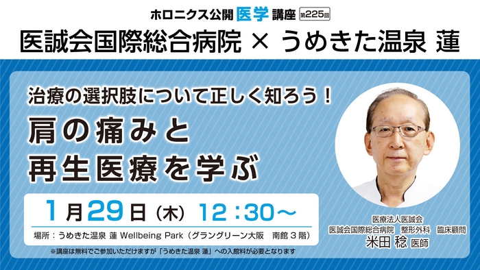 講師は、医誠会国際総合病院 整形外科 臨床顧問を務める米田 稔 医師が務めます。臨床現場での経験を踏まえ、肩の痛みの診断から治療までの流れを分かりやすく説明します。