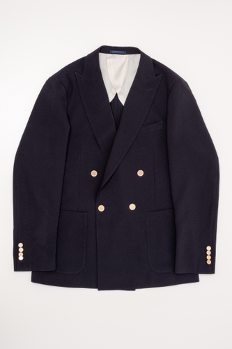 モダントラディショナルなデザインをベースに、軽快なアンコン仕立てを採用しており、ダブルでありながら日常的に羽織りやすいバランスに仕上がっています。肩先が角張らないよう調整された肩傾斜と袖山のパターンは、日本人の体型に自然に馴染むポイントです。