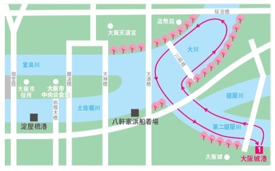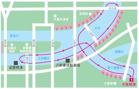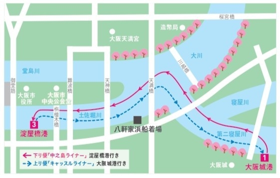 大阪でも有数のお花見スポット「大阪城公園」と歴史・文化の島・中之島の中心地「淀屋橋」を結ぶシャトルボートです。京阪電車やOsakaMetro、JRの駅近くにのりばがあるので、アクセス抜群!
