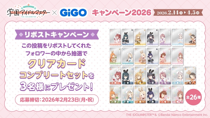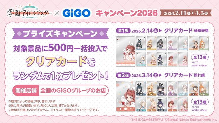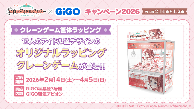 株式会社GENDA GiGO Entertainment(本社:東京都港区 代表取締役社長:二宮 一浩、以下「当社」)は、GiGOグループのお店におきまして、『アイドルマスター』シリーズの最新作、歌とダンスが上手くなるアイドル育成シミュレーションゲーム『学園アイドルマスター』とコラボした「『学園アイドルマスター』×GiGOキャンペーン2026」を2026年2月14日(土)より開催いたします。