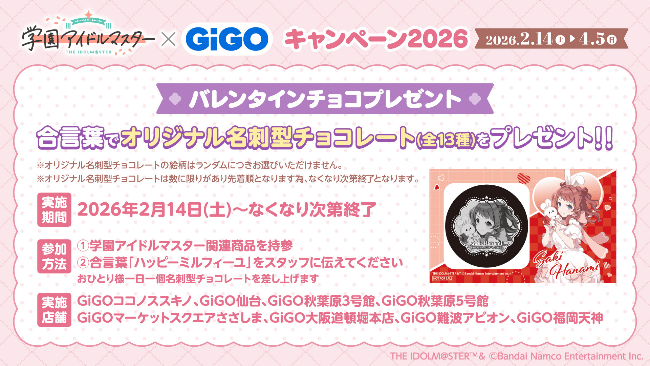 実施内容:対象店舗にて学園アイドルマスター関連商品をご持参のうえ、スタッフへ合言葉をお伝えいただくと、オリジナル名刺型チョコレート(全13種)を、1日おひとり様1個・ランダムでプレゼントいたします。
