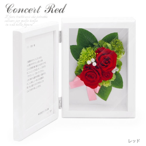 プリザーブドフラワーと電報が一体となったフォトフレームタイプ。