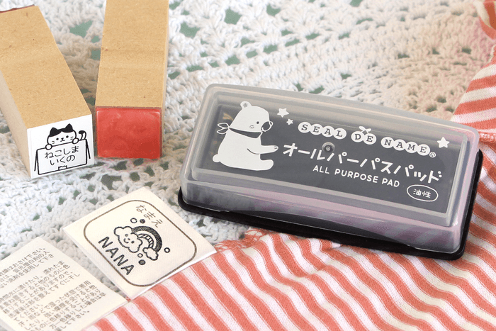 付属のインク台は、速乾性の顔料系インクでそのままお洗濯もできます。油性マジックのような感覚でご使用いただけますが、油性マジックとは違い、にじみにくくキレイに生地に押すことができます。