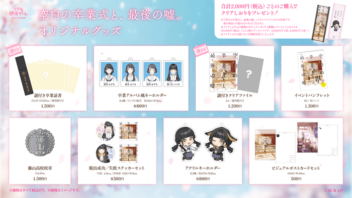 全世界で累計1,500万人以上を動員しているリアル脱出ゲームを企画制作する株式会社SCRAP(本社:東京都渋谷区、代表:加藤隆生)は、2025年2月19日(木)より開催する新作リアル脱出ゲーム『空白の卒業式と、最後の噓。』の、オリジナルグッズの情報を公開いたします。