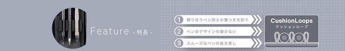 ペン同士が当たらず傷付かないクッションループを、すべてのペンケースに採用しています。