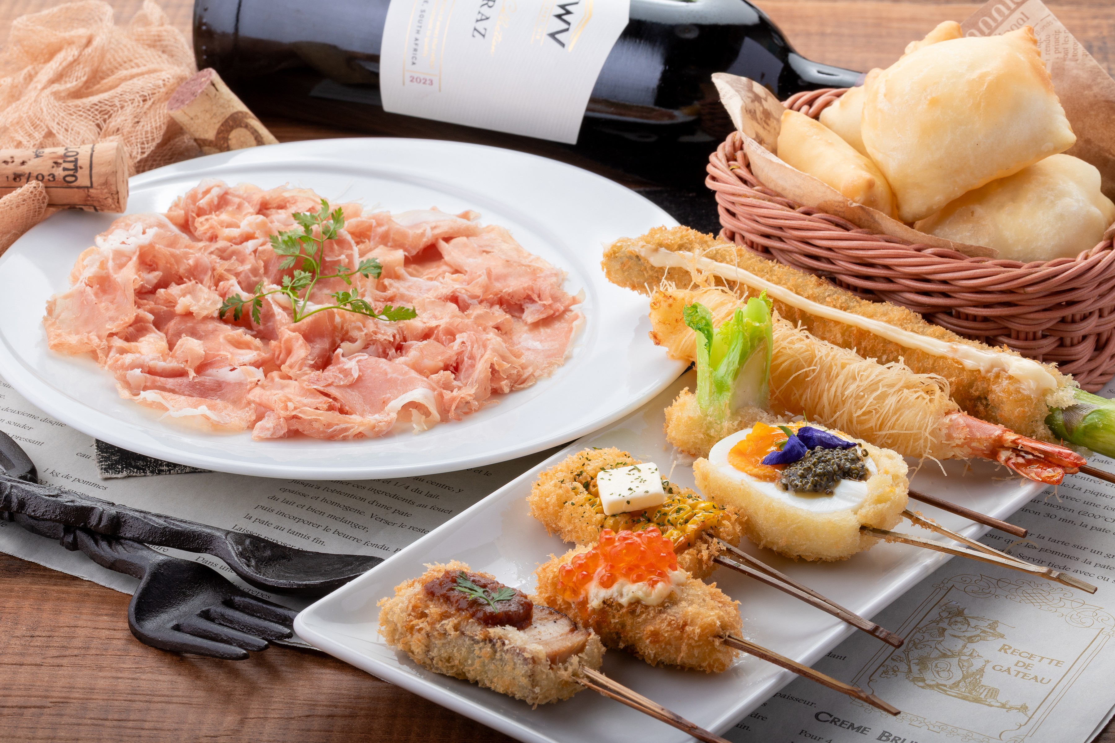 ディナータイムは、串カツをはじめ、フランス産生ハム、前菜、丼ものなどさまざまなフードメニュー約40種類をご用意します。串カツは、旬の食材を活かした月替わりの創作串のほか、肉串、魚串、野菜串、変わり種串など30種類以上(180円~)をラインナップ。衣は、コーン油と数種類の油を使いオリジナルブレンドすることで、アゲハ蝶のようなふんわりとした軽い口当たりになり、揚げ物ながらもヘルシーに仕上げています。当店限定で提供するフランス・バイヨンヌ産の生ハム「プロシュート」(980円~)は、スライサー機のロールスロイスといわれるイタリア・タマニーニ社の特殊機械で極限まで薄く切り出すことで、はらりと溶けるような繊細な口溶けを実現しました。サクサクとした軽やかな串カツと、しっとりとした生ハムの食感を交互にお楽しみいただくことで飽きずに食べ進めていただけます。ドリンクは、ソムリエオーナー厳選のワイン30種類をはじめ、フルーツで彩ったカクテルやビール、チューハイ、ハイボールなどをご用意いたします。