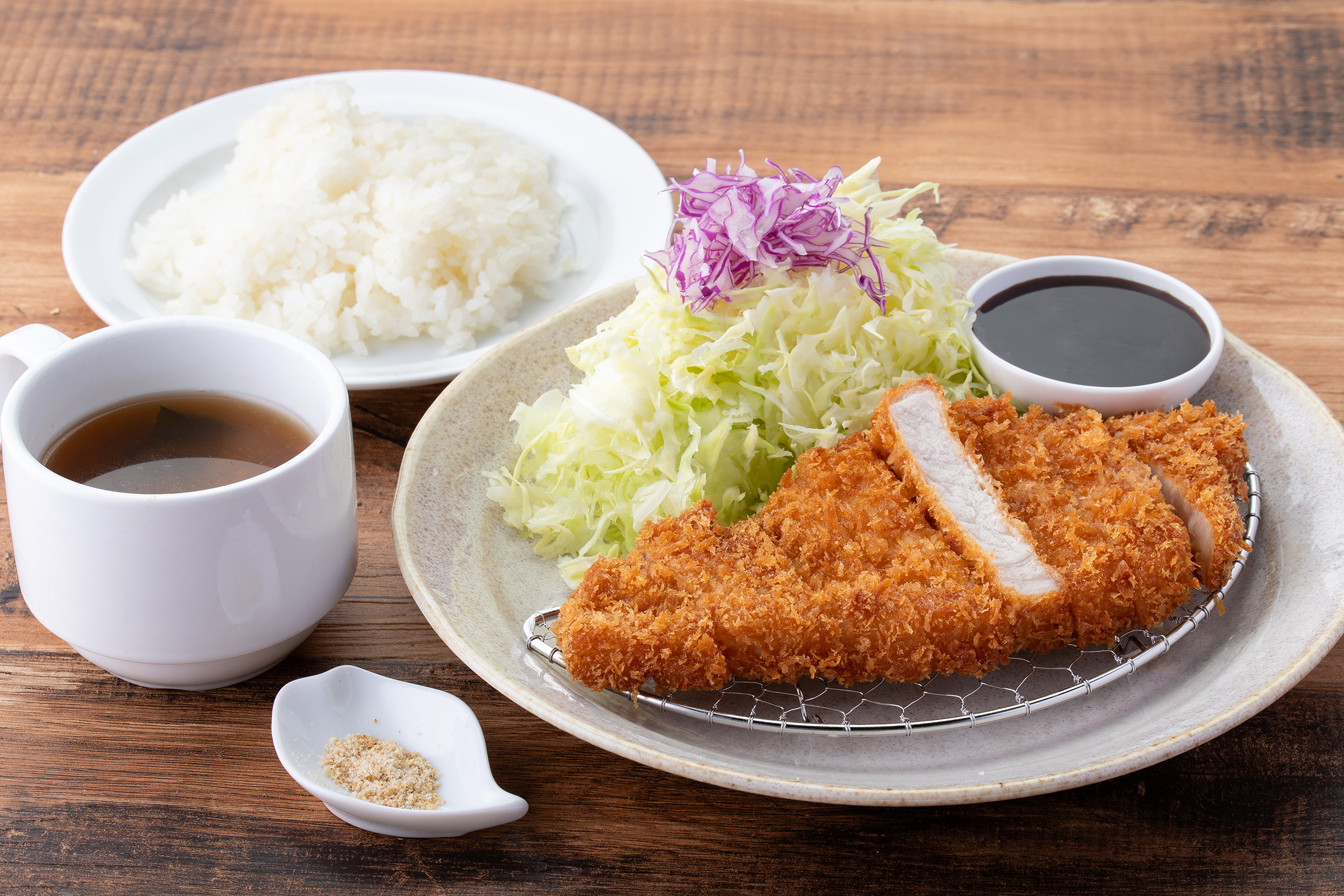 定食には、カツのほか、キャベツ、みそ汁、ご飯が付きます。