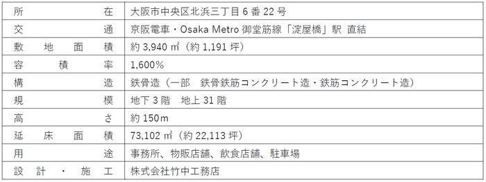 本事業は、中央日本土地建物株式会社が所有する「日土地淀屋橋ビル」と京阪ホールディングス株式会社が所有する「京阪御堂筋ビル」を共同で建て替え、エリア最高峰となる高さ約 150mのランドマークビルを開発したものです。オープンイノベーション施設を備えたオフィスゾーンや、商業ゾーン、婚礼等多目的に使えるイベントスペースなどからなる複合施設で、2024年8月5日に本事業の施設名称を「淀屋橋ステーションワン」に決定し、2025年6月23日に開業しました。