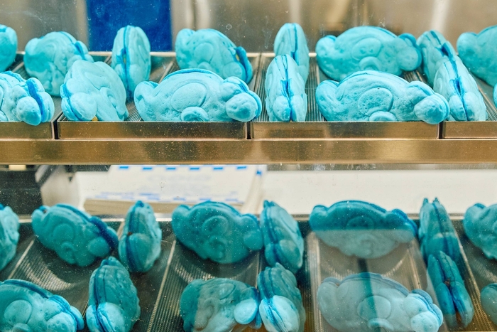 「白井さん」の顔を表現するために鉄板から造り上げ、さらに”白井さんブルー”を再現するために試作を重ね完成させた、「青い焼き物」です。