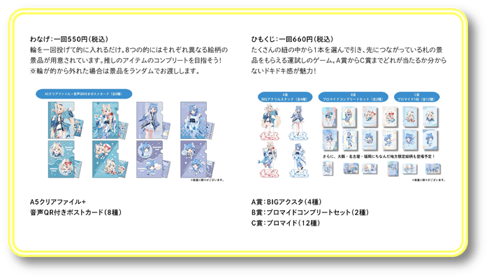 イベント限定グッズを多数ご用意しています。人気のアクリル系商品や祭りらしい法被、定番のトレーディング缶バッジなど、充実のラインナップでお客さまをお待ちしております。ご購入金額に応じて「ボイスポストカード」・「ショッパー」の特典をプレゼントするほか、通販限定で販売するぬいぐるみやプレミアム刺しゅう法被もあります。