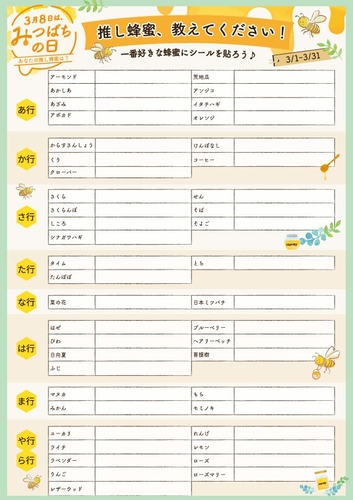 蜂蜜専門店ミールミィ(運営:株式会社金市商店)は、3月8日の「みつばちの日」にあわせ、2026年3月1日から3月31日までの1か月間、蜂蜜の魅力を楽しみながら知っていただく参加型企画を全店で開催いたします。