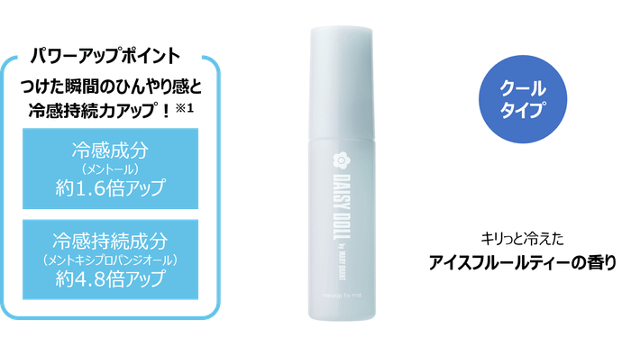 デイジードール メイクアップ フィックス ミストは2022年の発売以来、細かいミストが気持ちいい、メイクが崩れないと多くの支持を集めており、2025年に発売したクールタイプも暑い季節に快適に使えると嬉しい声をいただいております。今回の限定品は冷感効果がさらにパワーアップし、汗や水、皮脂などによる化粧崩れも防ぎます。キリっと引きしまるアイスフルールティーの香りで、暑い夏でもすっきりリフレッシュできます。