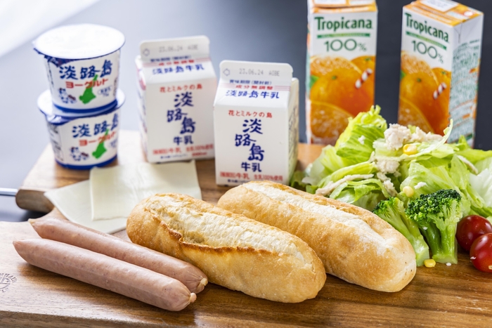翌朝は宿泊テントに併設されたテラスで朝食を提供します。ホットドッグ等に加え、淡路島ヨーグルト、淡路島牛乳、北坂養鶏場の生卵など淡路島らしさのある内容で、明石海峡の海風を感じながらゆったりと朝の時間を楽しめます。