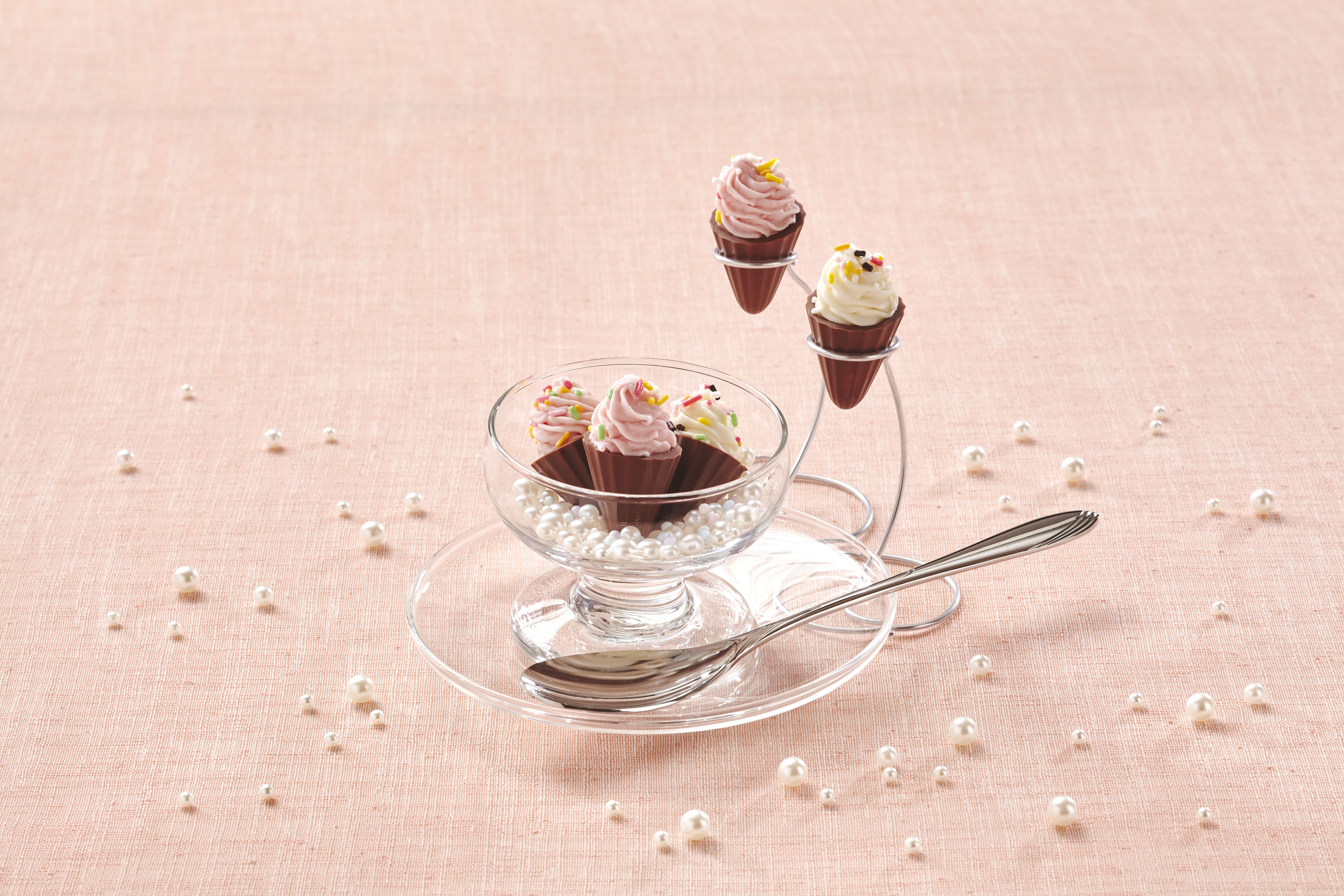 可愛らしいアイスクリーム型のフォルムが目を引く本商品は、香ばしい味わいのジャンドゥヤを詰め込んだミルクチョココーン仕立て。見た目の楽しさとともに、チョコレート専門店ならではの本格的な味わいをお楽しみいただけます。