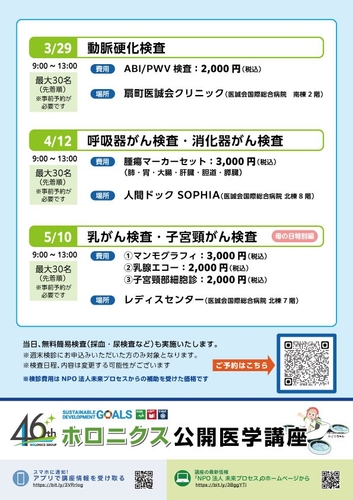 医療法人医誠会 医誠会国際総合病院(大阪府大阪市、代表者:谷 幸治)は、NPO法人未来プロセスが主催「週末検診」を協力開催します。3月29日(日) 9:00~13:00 「動脈硬化検査」を定員:30名で予約受付中です。本イベントはNPO法人未来プロセスの主催する公開医学講座とあわせて実施する医療啓発活動で、同法人の費用補助により、地域の方々に検診機会を広げることを目的としています。忙しくて平日には医療機関を受診できない方にも、お休みの日を利用して気軽に健康チェックを受けていただけます。