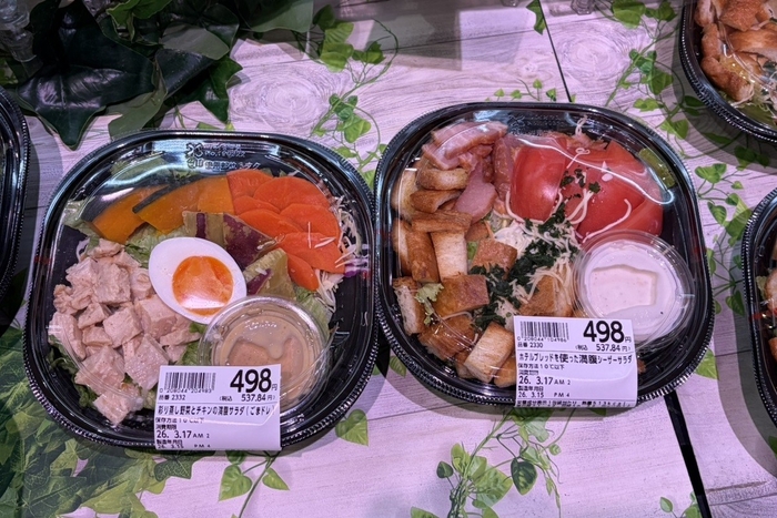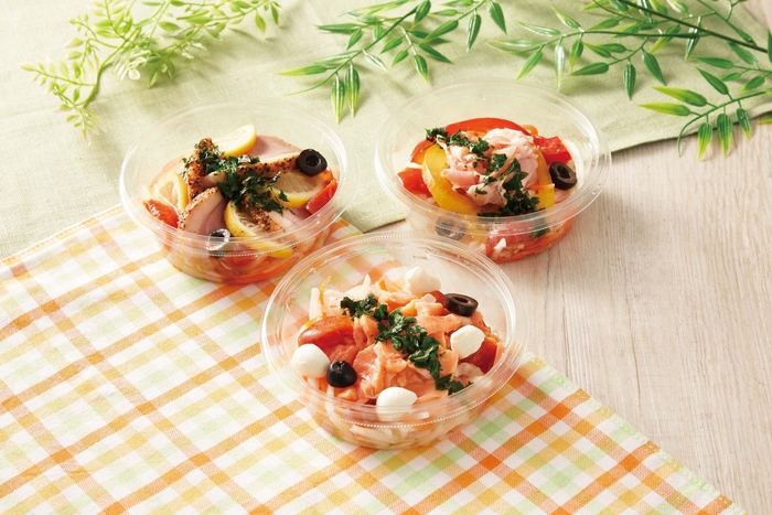 野菜とともに、ベーコンや鶏肉、たまごなどのたんぱく質が一緒に摂れる、満腹サラダ各種を品ぞろえいたします。