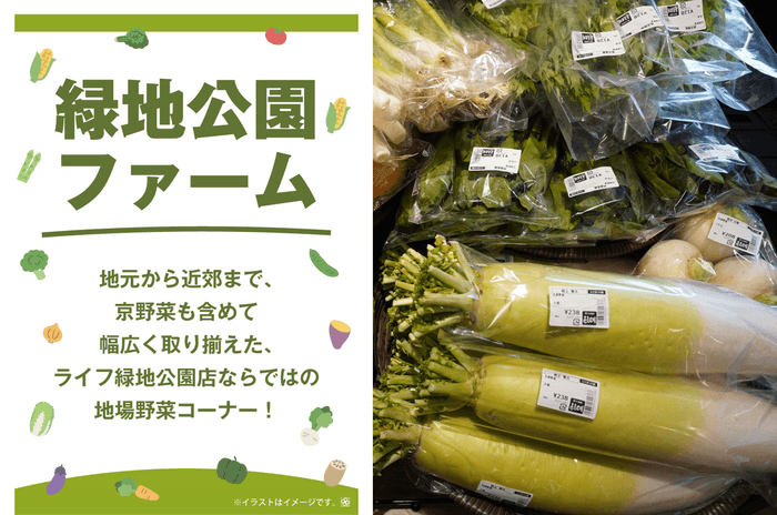 地元江坂や関西近郊で採れた野菜・京都府産の伝統野菜を「緑地公園ファーム」として集合展開いたします。
