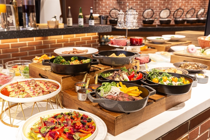 店内のリニューアルと同時に、朝食ビュッフェメニューもリニューアルし、レストランの空間コンセプトである「水と文化がつなぐ、京都と地中海」を料理にも反映させました。鴨川や琵琶湖疏水といった京都の街を潤してきた清らかな水の文化と、異なる大陸を結びつけ文明の交流を育んできた地中海の恵み。この二つの「水と文化の物語」が、一つのテーブルでやわらかく交わります。京野菜、湯葉、白味噌、出汁といった京都の伝統食材に、オリーブオイルやハーブ、チーズなど地中海のエッセンスを融合させた新メニューとして「京都の野菜と魚介類マリネ」、「京都産豚肉のリヨン風」、「丹波地どりのジェノバ風」などを日替わりでご用意いたします。和と洋の技法を掛け合わせることで、国内外のゲストに親しみやすい味わいを提案いたします。